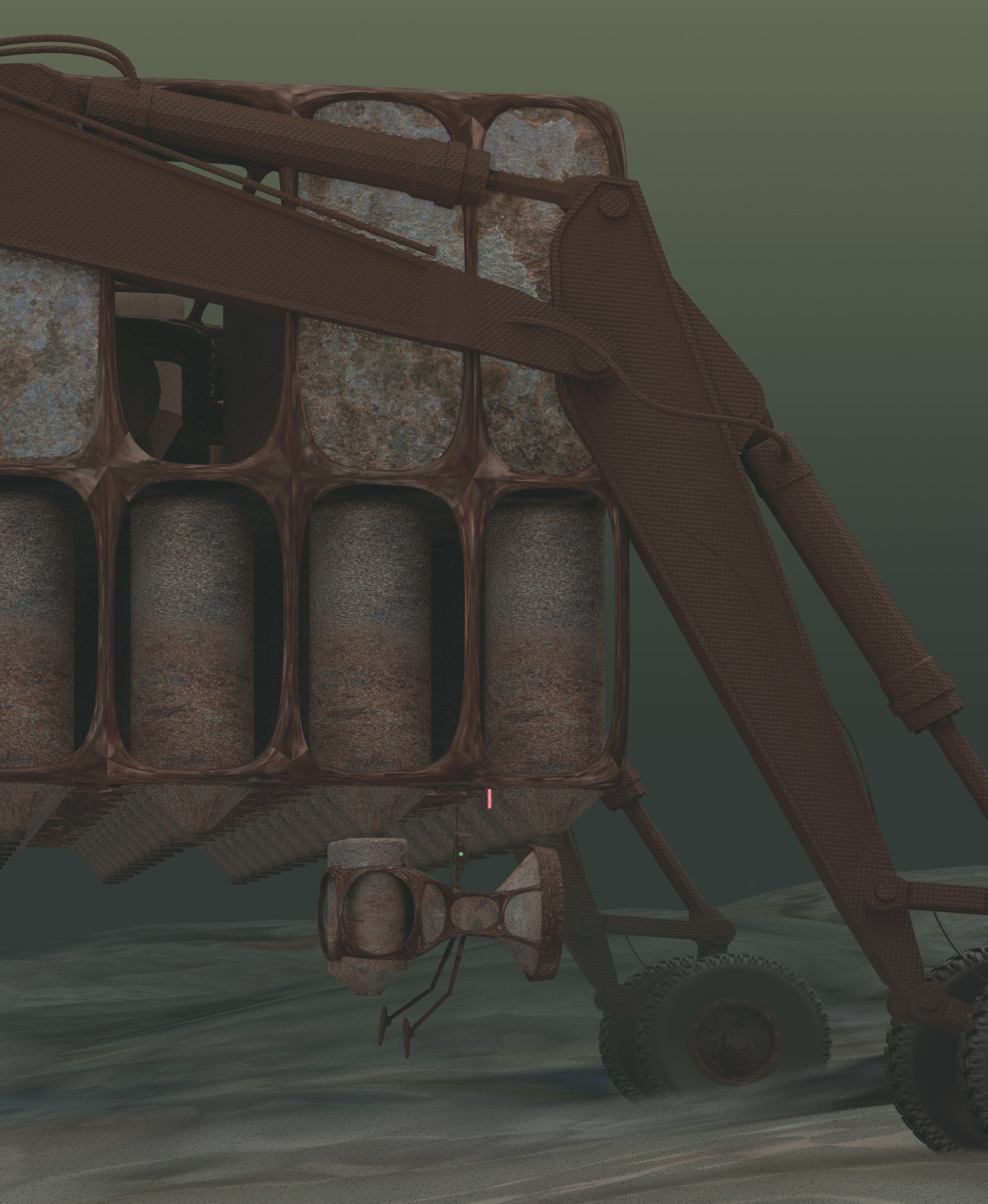 The mycycler receives the packages and shreds the compressed plastic inside, the bits are fed into the silos where the mycelium is waiting to feast. When needed to restock, the mycycler also receives grown mushrooms which are processed to be clipped and extract the mycelium on the other side of the mycycler. The mycelium breaks down the shreds and creates a biofertilizer which is stored in the silos awaiting distribution